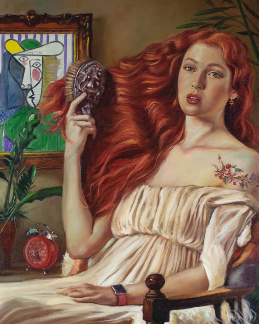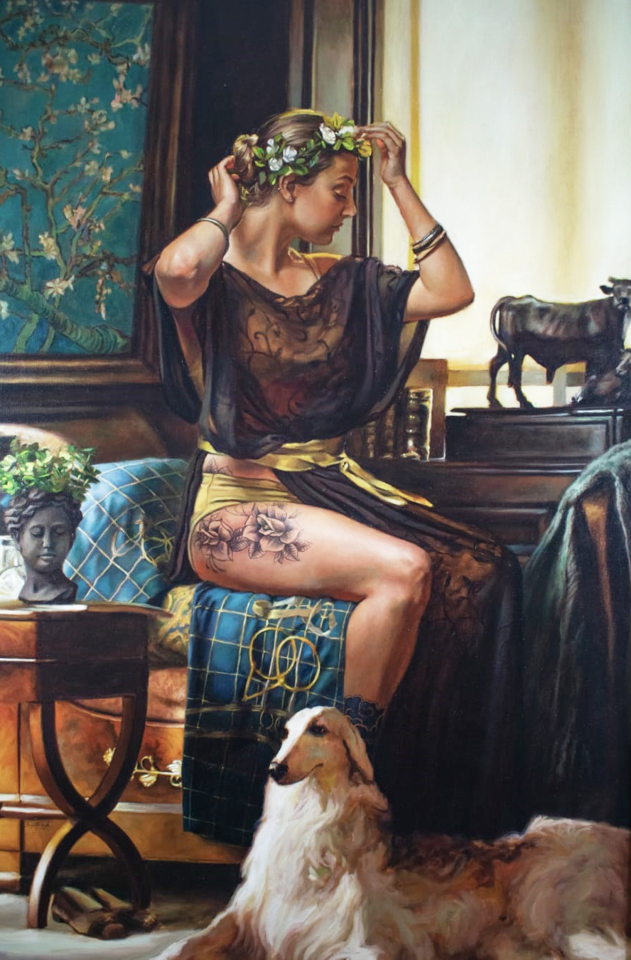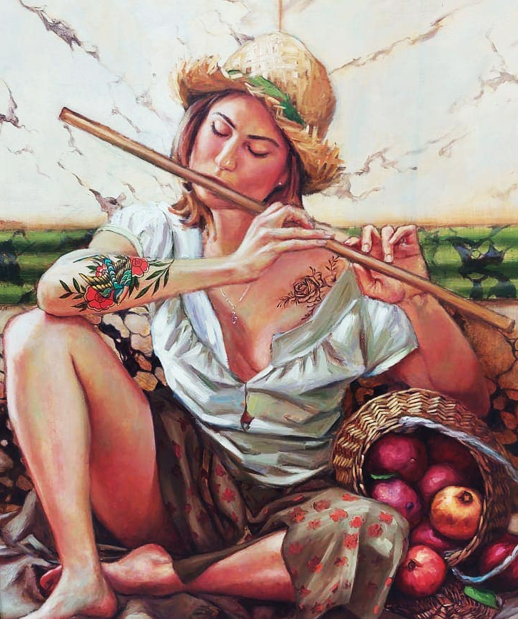 “Ergo, Venus” es una colección de 15 pinturas donde la mujer es protagonista con detalles que mezclan el pasado y el presente. Así, Betzalel Maida nos muestra damas sensuales que pueden llevar ropaje de la Grecia clásica y tatuajes modernos, y portar en sus manos un celular o un reloj. Fue la primera muestra en solitario del artista que pinta desde sus 13 años y que se ha decantado por lo figurativo en óleo, carboncillo, acuarela y pastel. Sus referentes son los españoles Joaquín Sorolla (18631923) y Diego Velázquez (1599-1660), el inglés John William Godward (1861-1922) y el estadounidense John Singer Sargent (18561925).