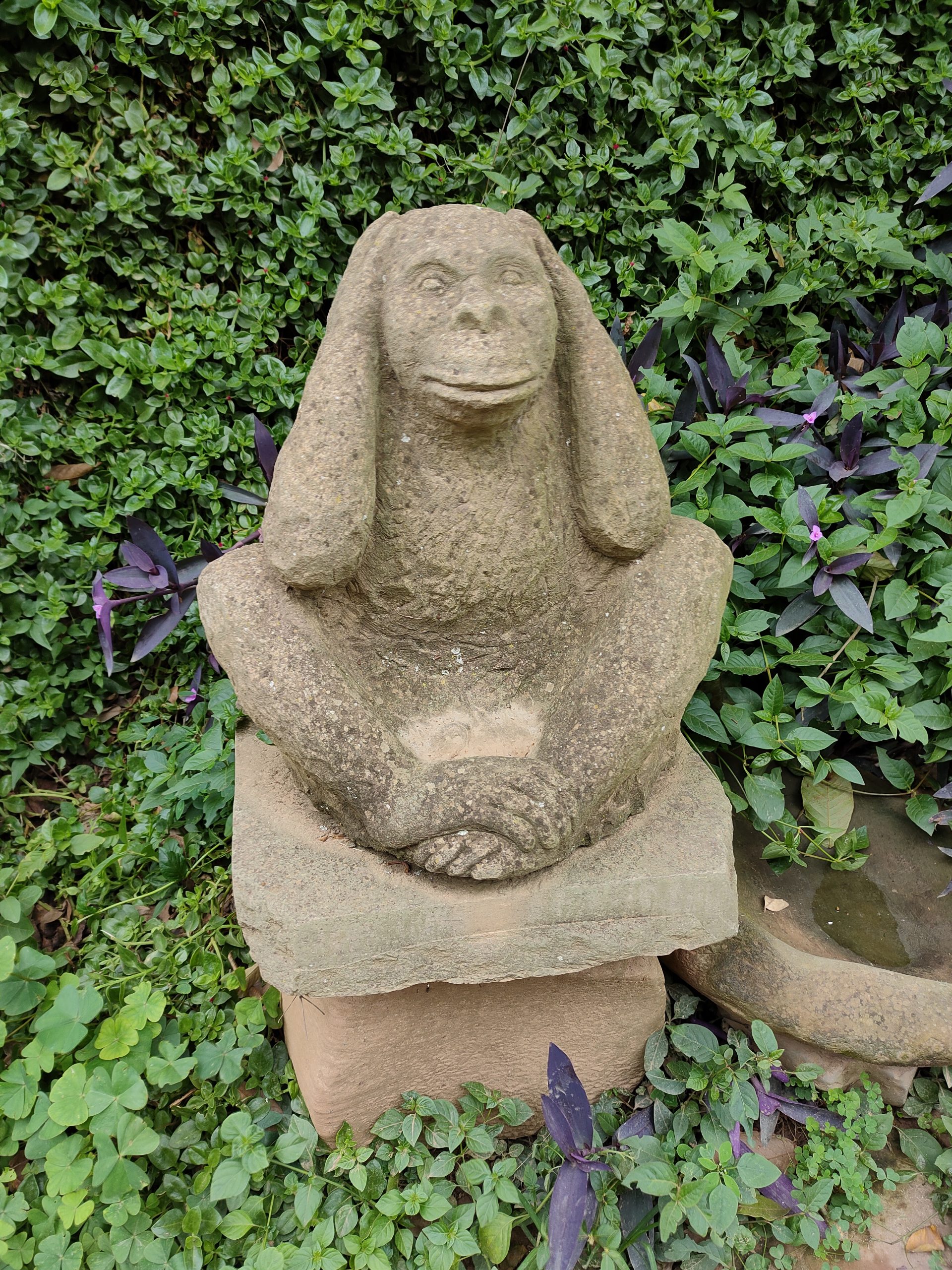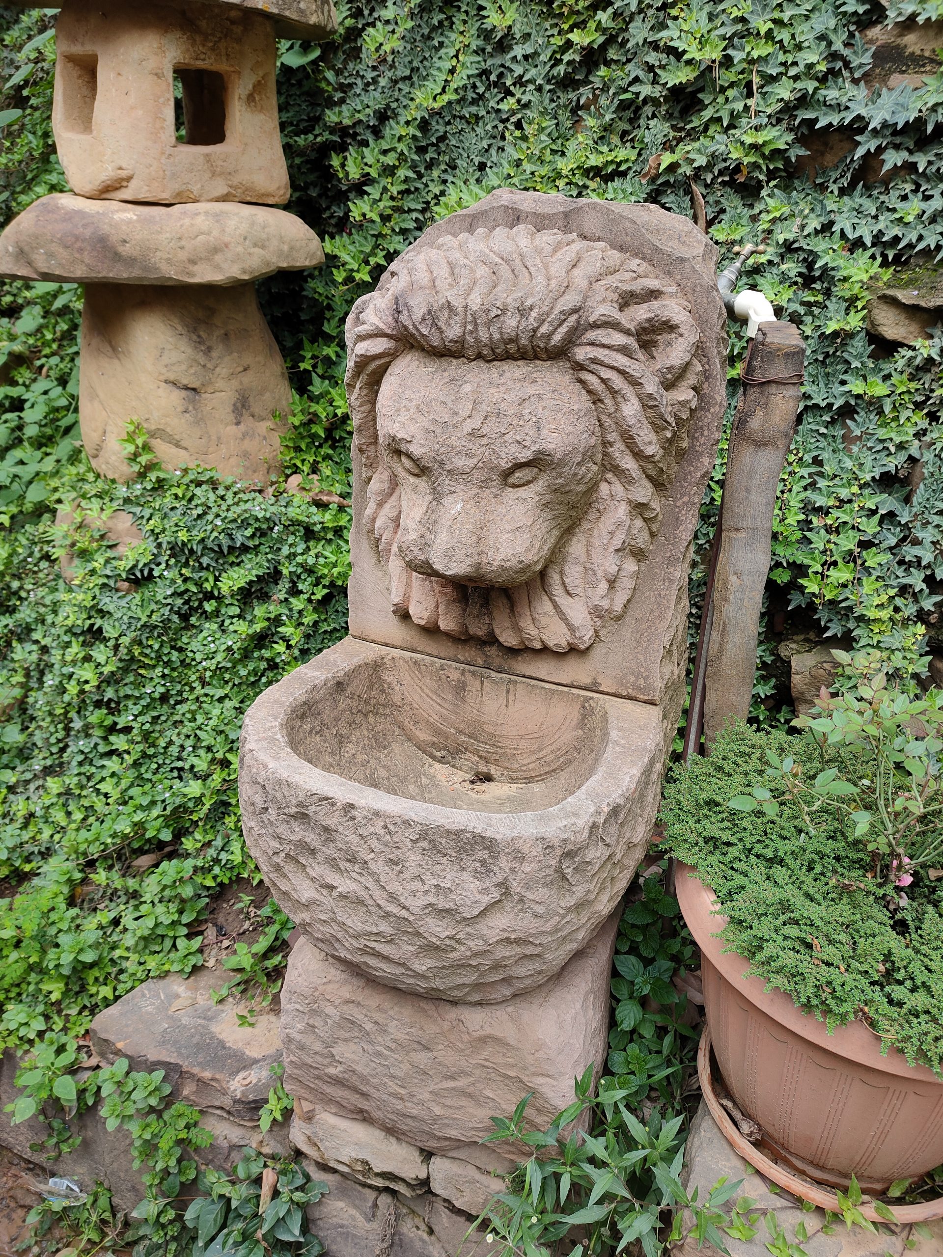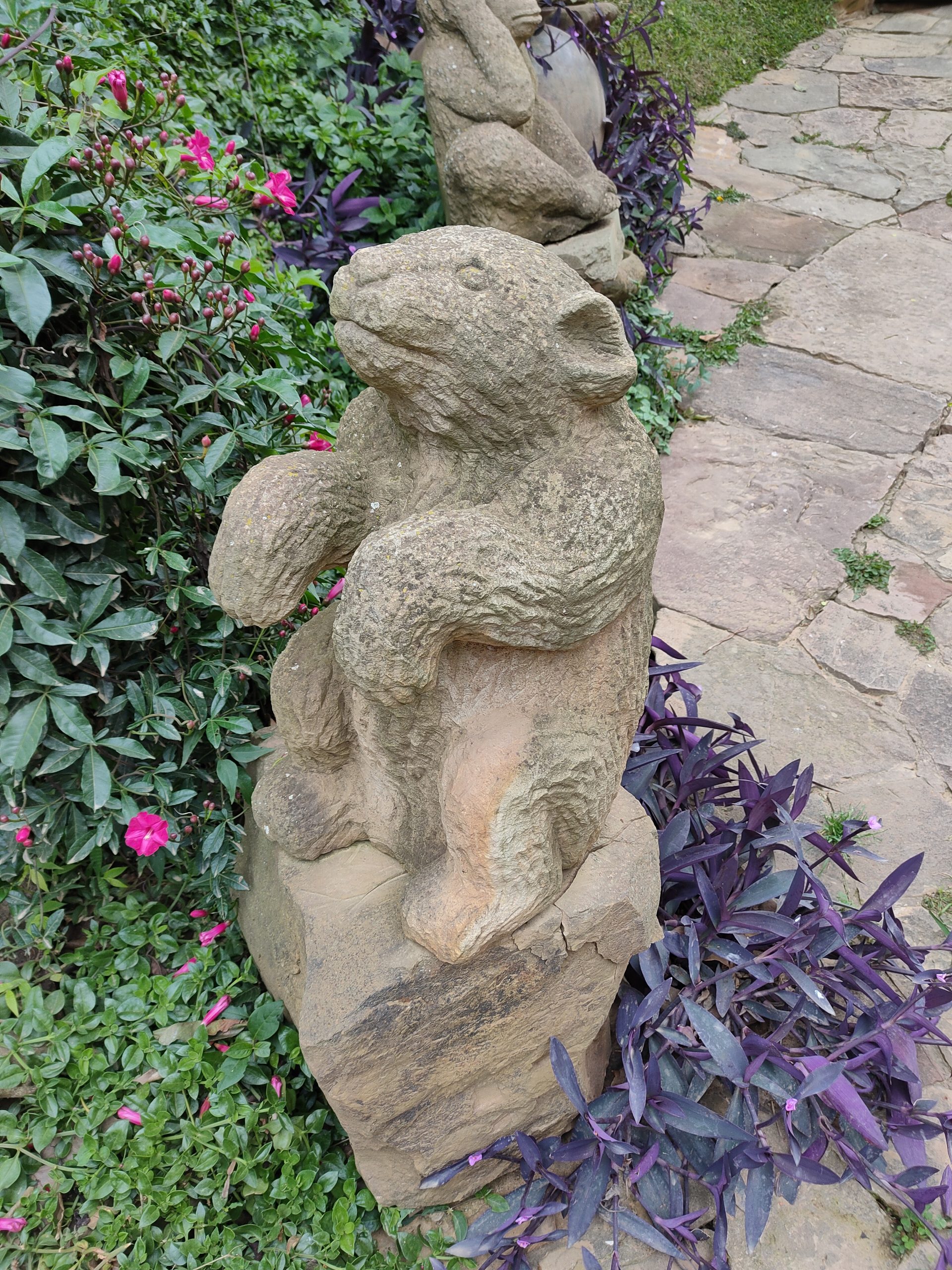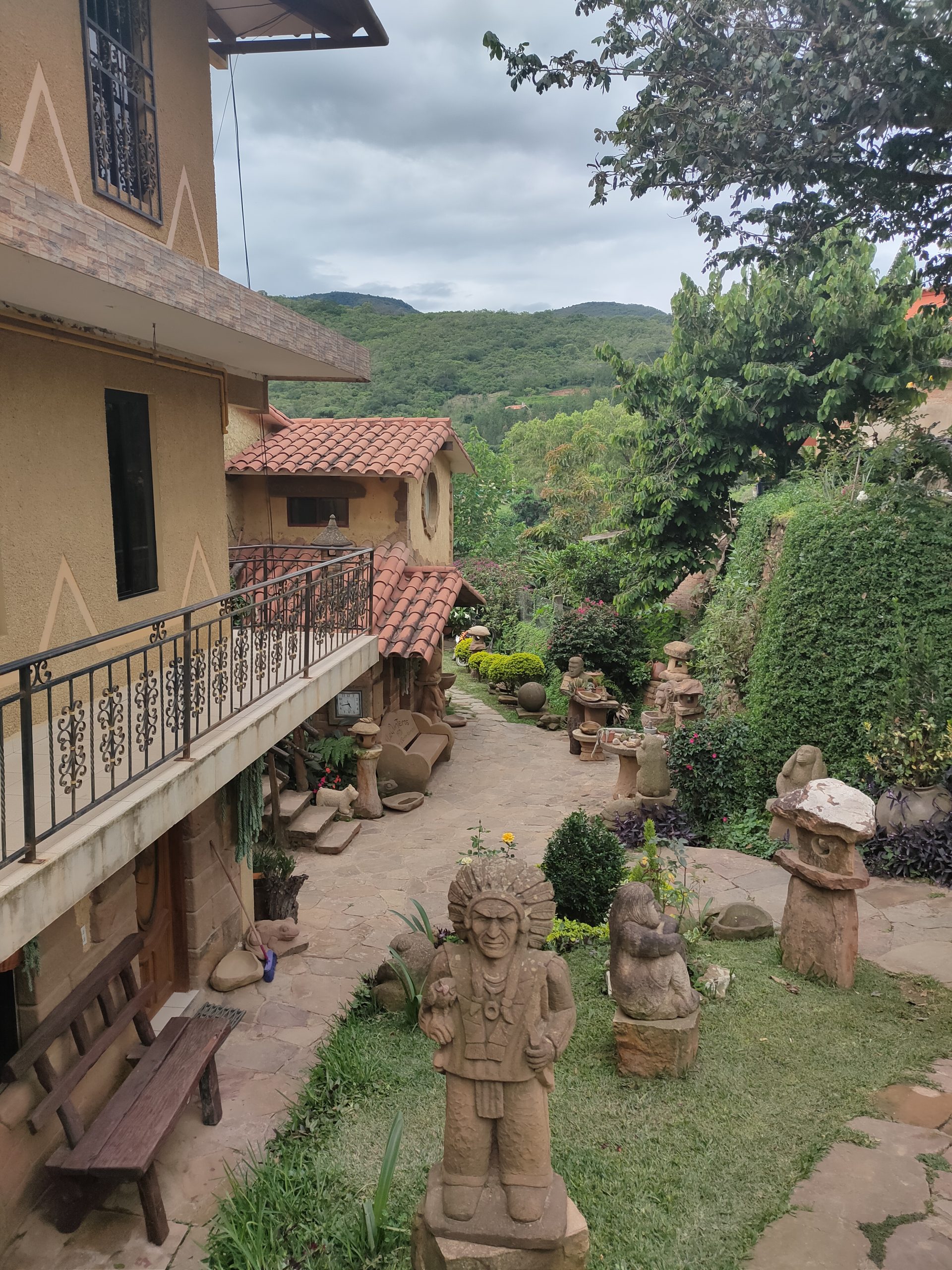 Aunque no lo confiese, es perceptible su tristeza al hablar de la venta de la casa que construyó con esfuerzo y mucho talento. El inmueble bien pudo servir para la filmación de El señor de los anillos: sus habitaciones recubiertas de piedra con detalles de madera son tan atractivas como su jardín, una permanente galería de arte, su arte: esculturas pétreas en diversas dimensiones están dispuestas desde el mismo ingreso. Así, un apache da la bienvenida al visitante; luego aparecen tortugas, sapos, osos, halcones, salamandras… Y no faltan los objetos utilitarios como las fuentes de agua, letreros, bancas y morteros, ¡todo hecho a mano con martillo y cincel!